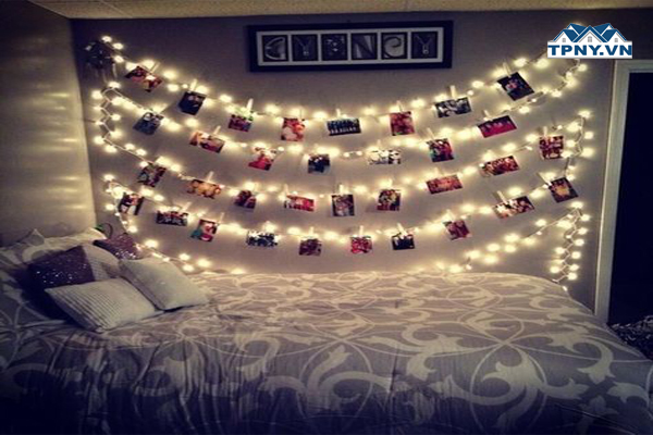 Phòng ngủ trang trí Polaroid và đèn led
