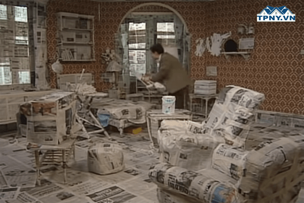 Bạn đã từng xem qua tập phim hài sơn nhà của Mr.Bean chưa? Bạn che các đồ vật trong nhà bằng những vật không thấm sơn rồi đem những thứ có thể di chuyển được ra khỏi vùng cần sơn. Còn những đồ vật đã được đặt cố định, bạn dùng các loại giấy báo cũ che chắn các đồ đạc bên trong nhà. Bước này giúp các đồ đạc trong nhà không bị dính sơn trong quá trình thi công. Các công tắc điện trong căn phòng đó nên sử dụng băng dính (nên lót trước một miếng màng rồi mới dán băng dính để keo không xót lại trên bề mặt)